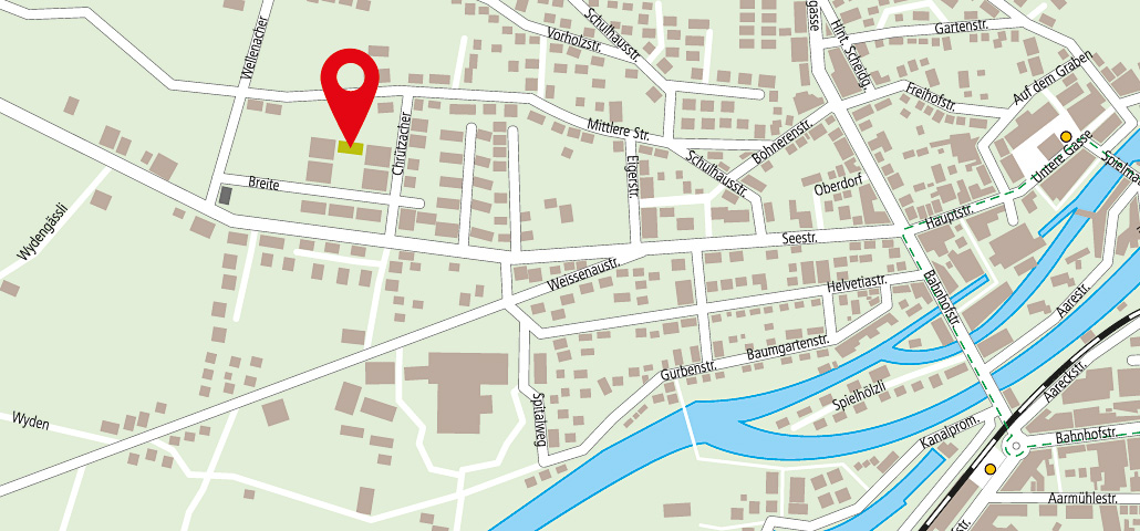 Autostrasse A8, Ausfahrt Unterseen, Richtung Unterseen, Abzweigungen nach links in die Breite 2 vor der Abzweigung zum Spital. Zur Praxis gehören 4 Parkplätze in der Tiefgarage.